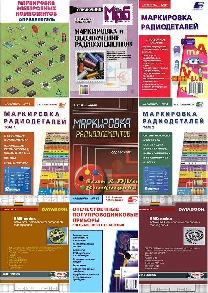 Книги по цветовой и кодовой маркировке радиоэлементов импортного и отечественного производства по номиналам, рабочему напряжению, допускам и другим характеристикам. В них вы найдете данные по буквенной, цветовой и кодовой маркировке компонентов, по кодовой маркировке зарубежных полупроводниковых приборов для поверхностного монтажа , логотипы и буквенные сокращения при маркировке микросхем ведущих зарубежных производителей, а также рекомендации по использованию и проверке исправности электронных компонентов. В большинстве справочников приводится информация по отдельным типам радиокомпонентов (транзисторы, диоды и т. д. ). Книги предназначены для специалистов по ремонту радиоэлектронной аппаратуры, а также широкого круга радиолюбителей.